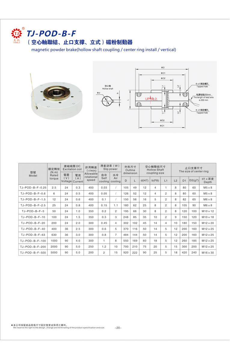 東莞天機(jī)傳動廠家生產(chǎn)的空心軸磁粉剎車器又稱立式磁粉剎車器是磁粉制動器中的一種??招妮S磁粉剎車器價格分為:TJ-POD-B-F、TJ-POD-B、TJ-POD-A、TJ-POD-B-E。這幾種型號的磁粉剎車器都為空心軸連接,立式止口支撐,使用的DC24V安全電壓。