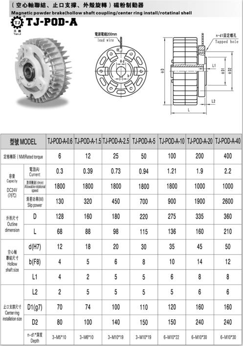 空心磁粉制動器廠家型號分為:TJ-POD-A-0.6、TJ-POD-A-1.5、TJ-POD-A-2.5、TJ-POD-A-5、TJ-POD-A-10、TJ-POD-A-20、TJ-POD-A-40;等更大轉(zhuǎn)矩的磁粉制動器。