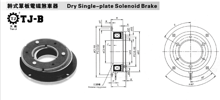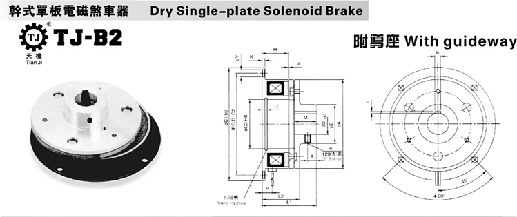 東莞天機傳動的電磁制動器(電磁剎車器)有三款分別為:干式單板電磁制動器(TJ-B)、干式單板電磁制動器帶導座(TJ-B1)、干式單板電磁制動器服軸承導座(TJ-B2)